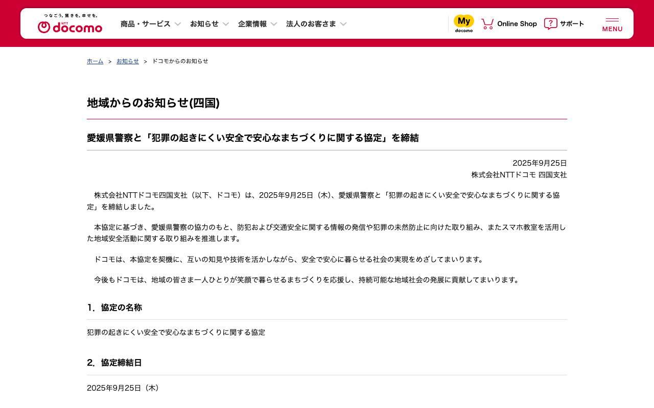 地域からのお知らせ(四国) : 愛媛県警察と「犯罪の起きにくい安全で安心なまちづくりに関する協定」を締結 | お知らせ | NTTドコモ