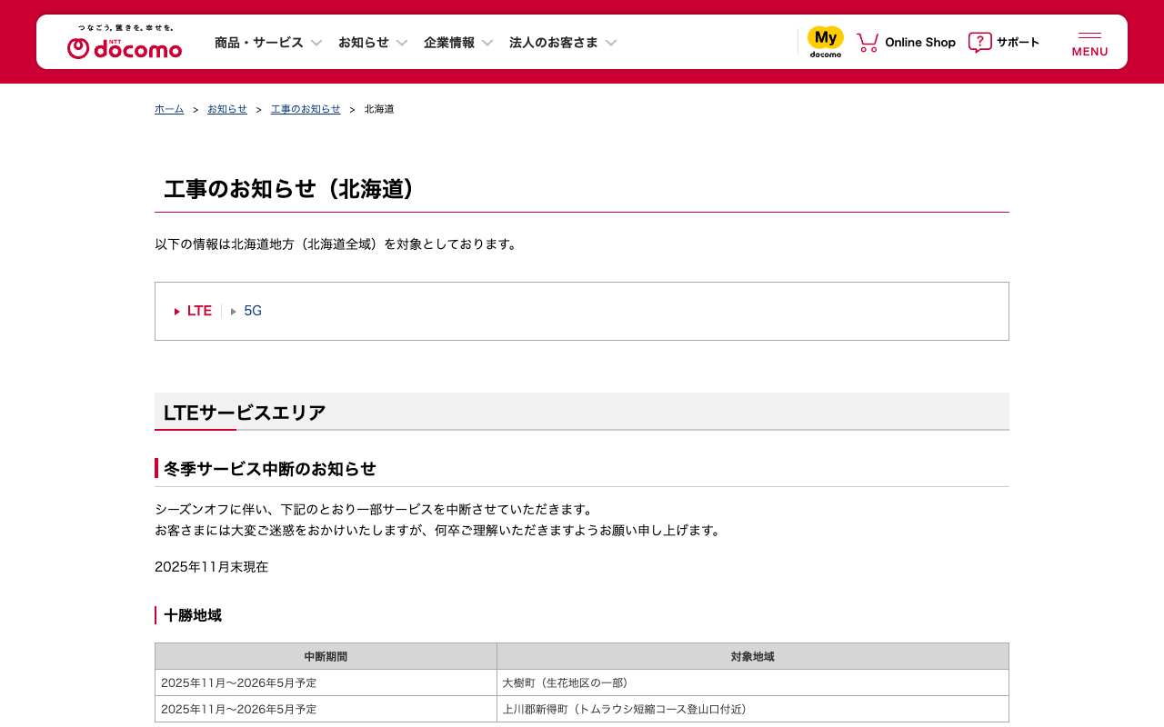 工事のお知らせ(北海道) : LTE | お知らせ | NTTドコモ