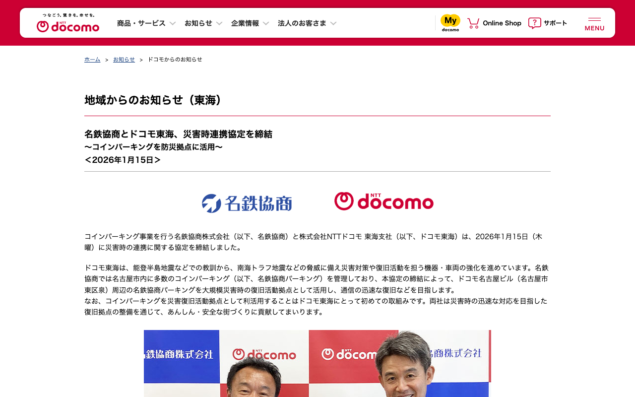 地域からのお知らせ(東海) : 名鉄協商とドコモ東海、災害時連携協定を締結~コインパーキングを防災拠点に活用~ | お知らせ | NTTドコモ