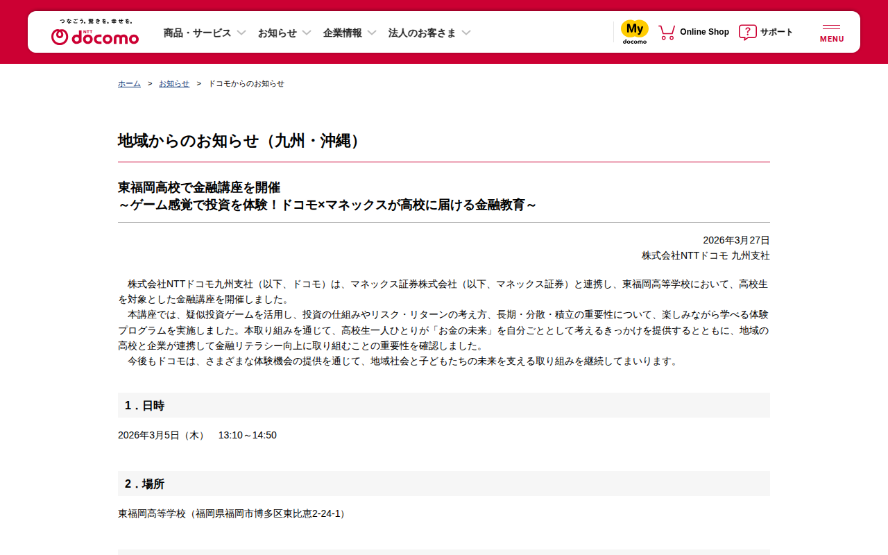 地域からのお知らせ(九州・沖縄) :東福岡高校で金融講座を開催~ゲーム感覚で投資を体験!ドコモ×マネックスが高校に届ける金融教育~ | お知らせ | NTTドコモ