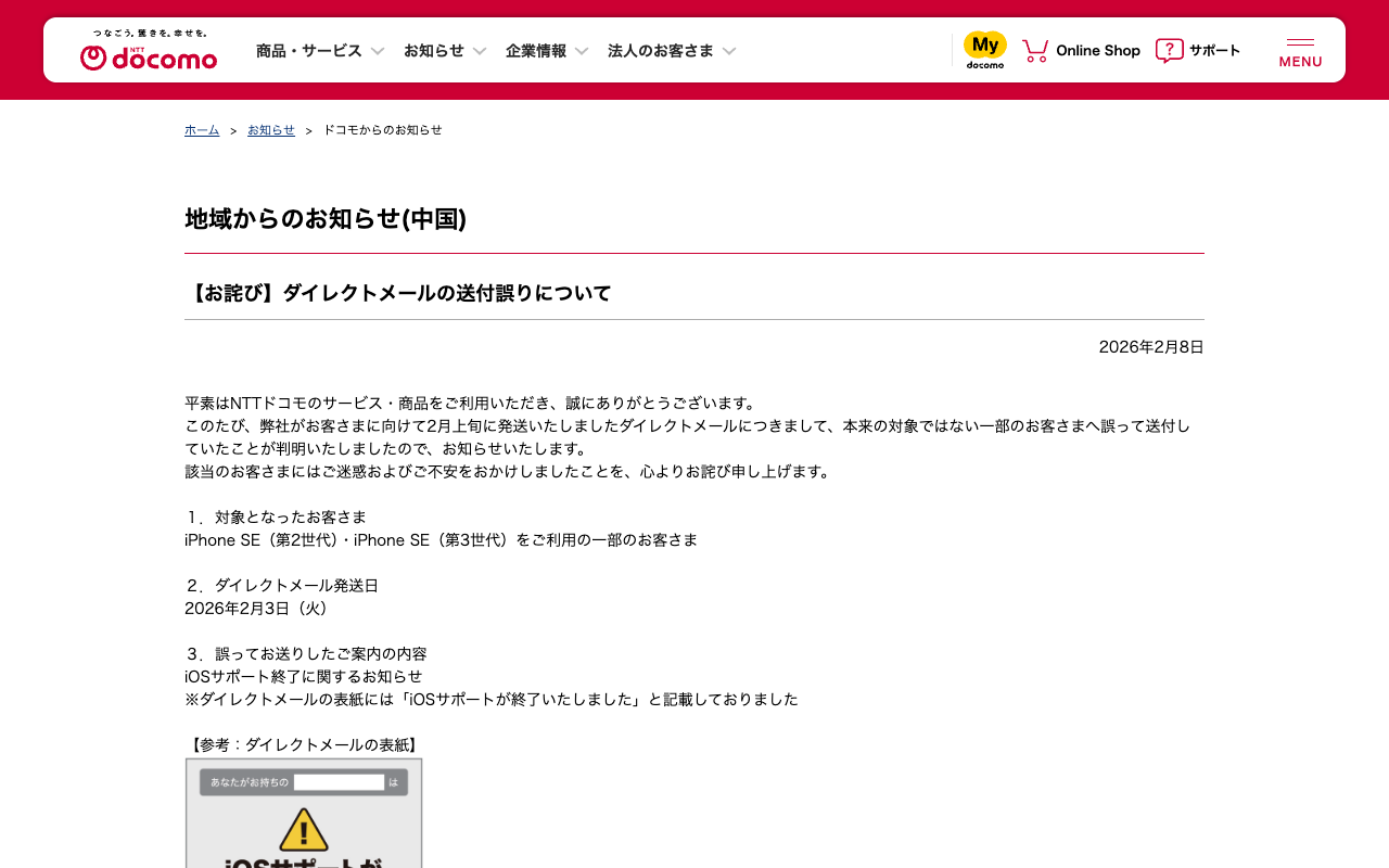 地域からのお知らせ(中国) : 【お詫び】ダイレクトメールの送付誤りについて | お知らせ | NTTドコモ
