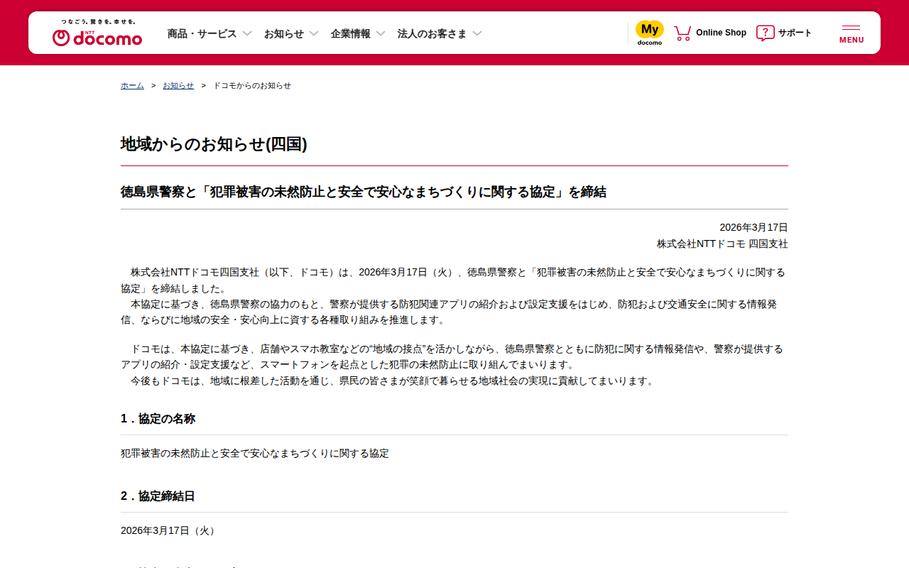 地域からのお知らせ(四国) : 徳島県警察と「犯罪被害の未然防止と安全で安心なまちづくりに関する協定」を締結 | お知らせ | NTTドコモ