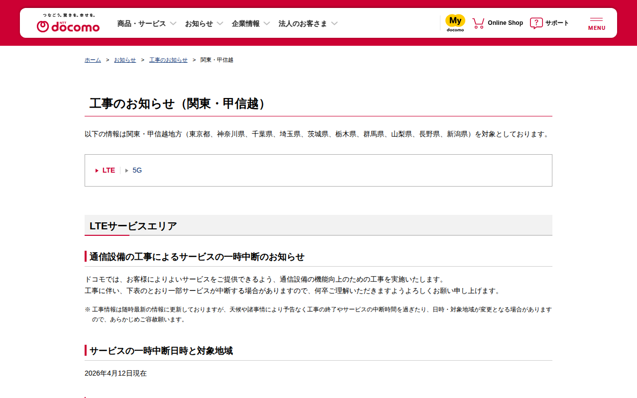工事のお知らせ(関東・甲信越) : LTE | お知らせ | NTTドコモ