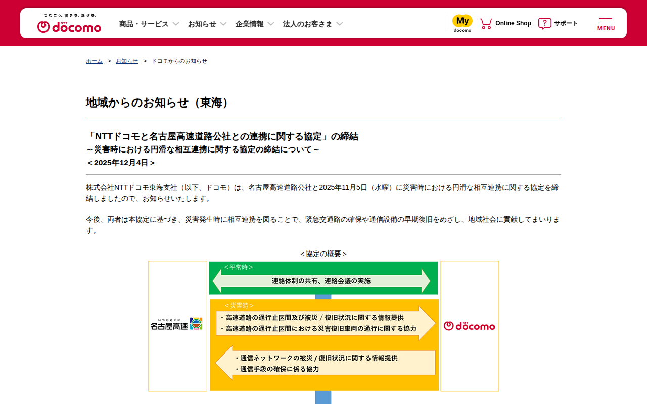 地域からのお知らせ(東海) : 「NTTドコモと名古屋高速道路公社との連携に関する協定」の締結~災害時における円滑な相互連携に関する協定の締結について~ | お知らせ | NTTドコモ