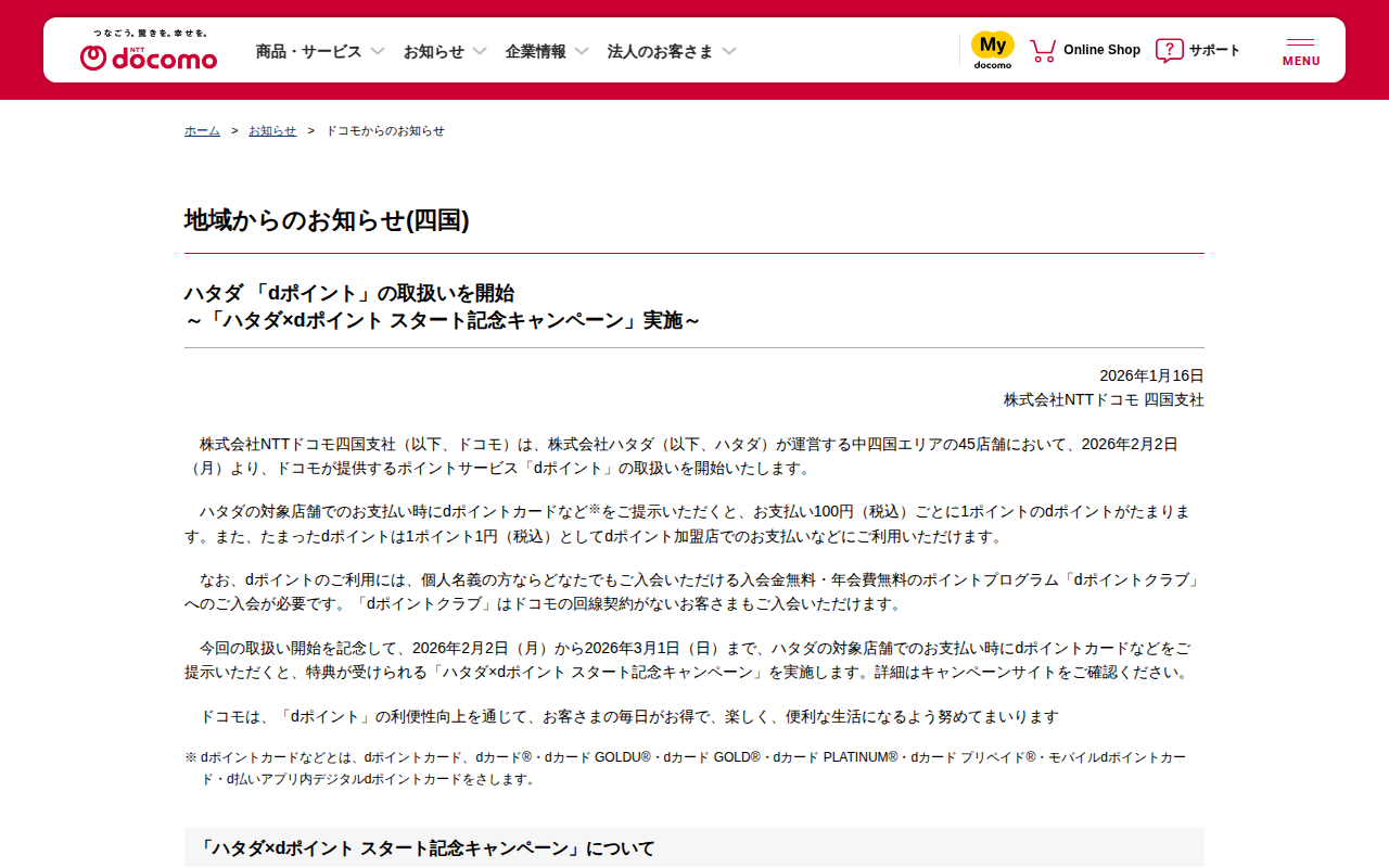 地域からのお知らせ(四国) : ハタダ 「dポイント」の取扱いを開始~「ハタダ×dポイント スタート記念キャンペーン」実施~ | お知らせ | NTTドコモ