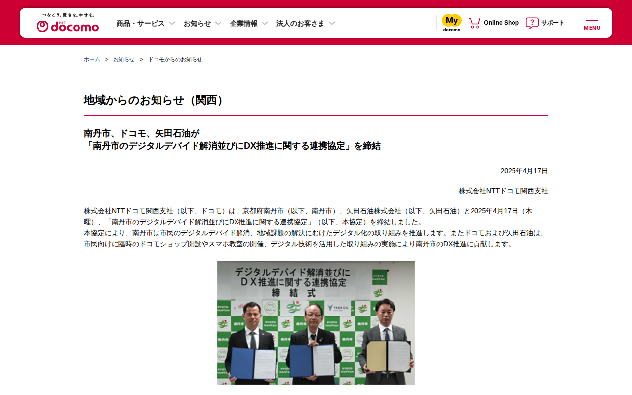 地域からのお知らせ(関西) : 南丹市、ドコモ、矢田石油が「南丹市のデジタルデバイド解消並びにDX推進に関する連携協定」を締結 | お知らせ | NTTドコモ