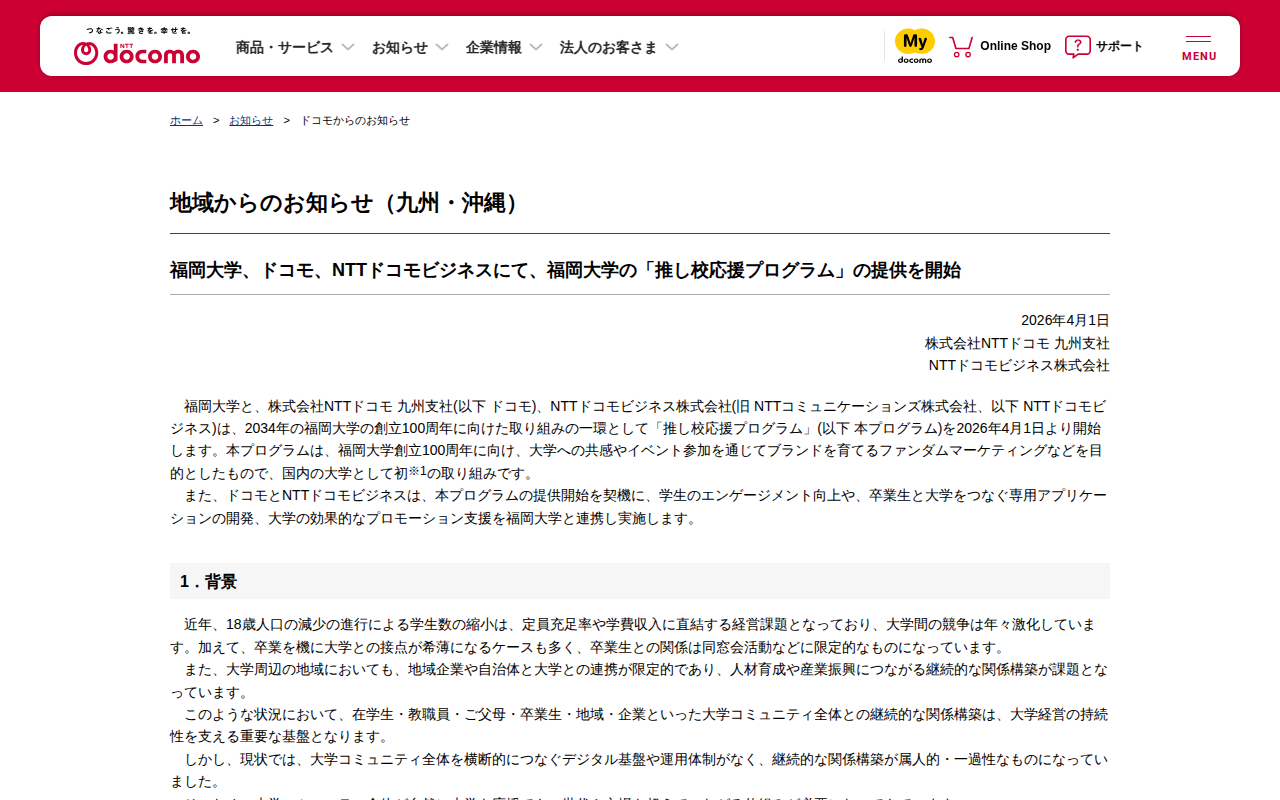 地域からのお知らせ(九州・沖縄) : 福岡大学、ドコモ、NTTドコモビジネスにて、福岡大学の「推し校応援プログラム」の提供を開始 | お知らせ | NTTドコモ