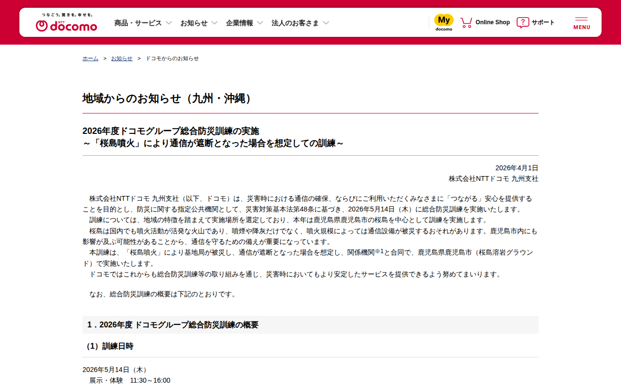 地域からのお知らせ(九州・沖縄) : 2026年度ドコモグループ総合防災訓練の実施~「桜島噴火」により通信が遮断となった場合を想定しての訓練~ | お知らせ | NTTドコモ