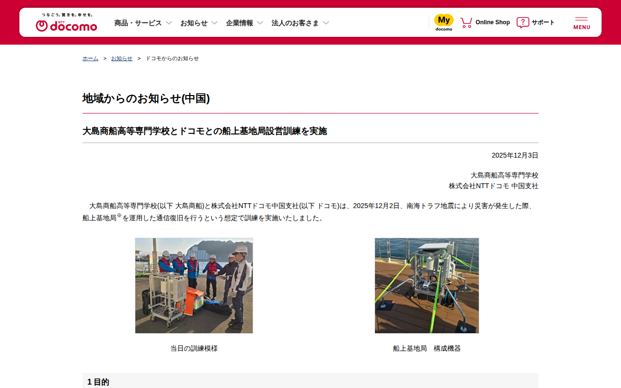 地域からのお知らせ(中国) : 大島商船高等専門学校とドコモとの船上基地局設営訓練を実施| お知らせ | NTTドコモ