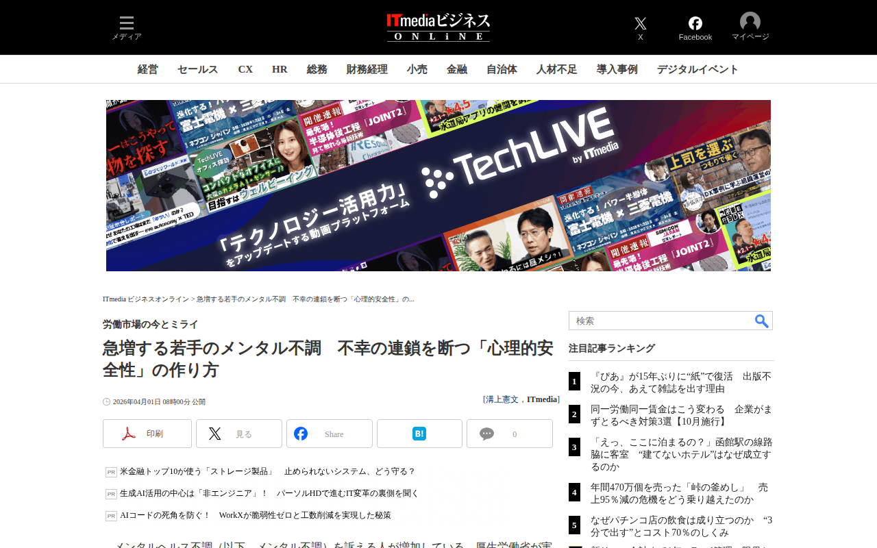 急増する若手のメンタル不調 不幸の連鎖を断つ「心理的安全性」の作り方:労働市場の今とミライ(1/5 ページ) - ITmedia ビジネスオンライン