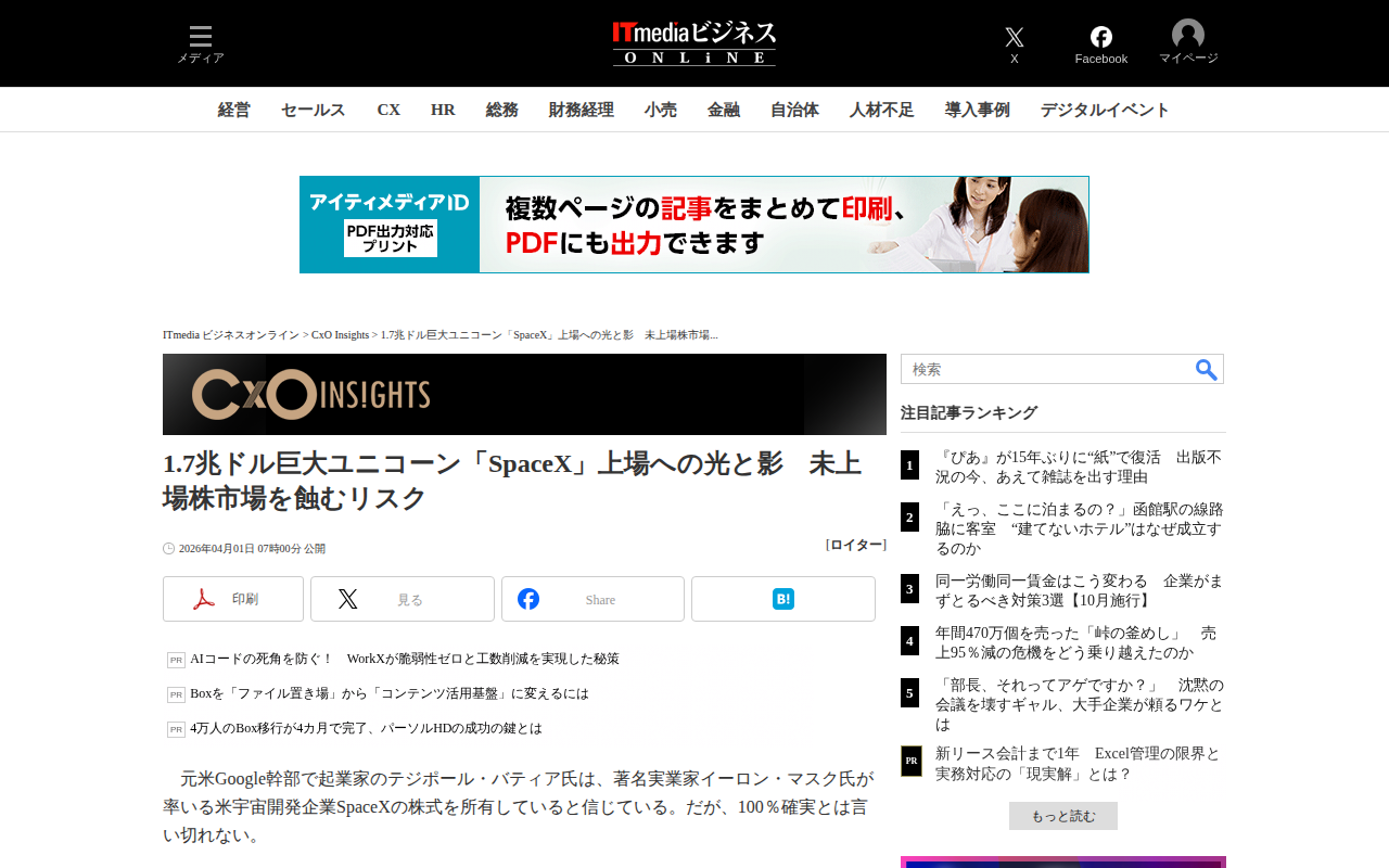 1.7兆ドル巨大ユニコーン「SpaceX」上場への光と影 未上場株市場を蝕むリスク - ITmedia ビジネスオンライン