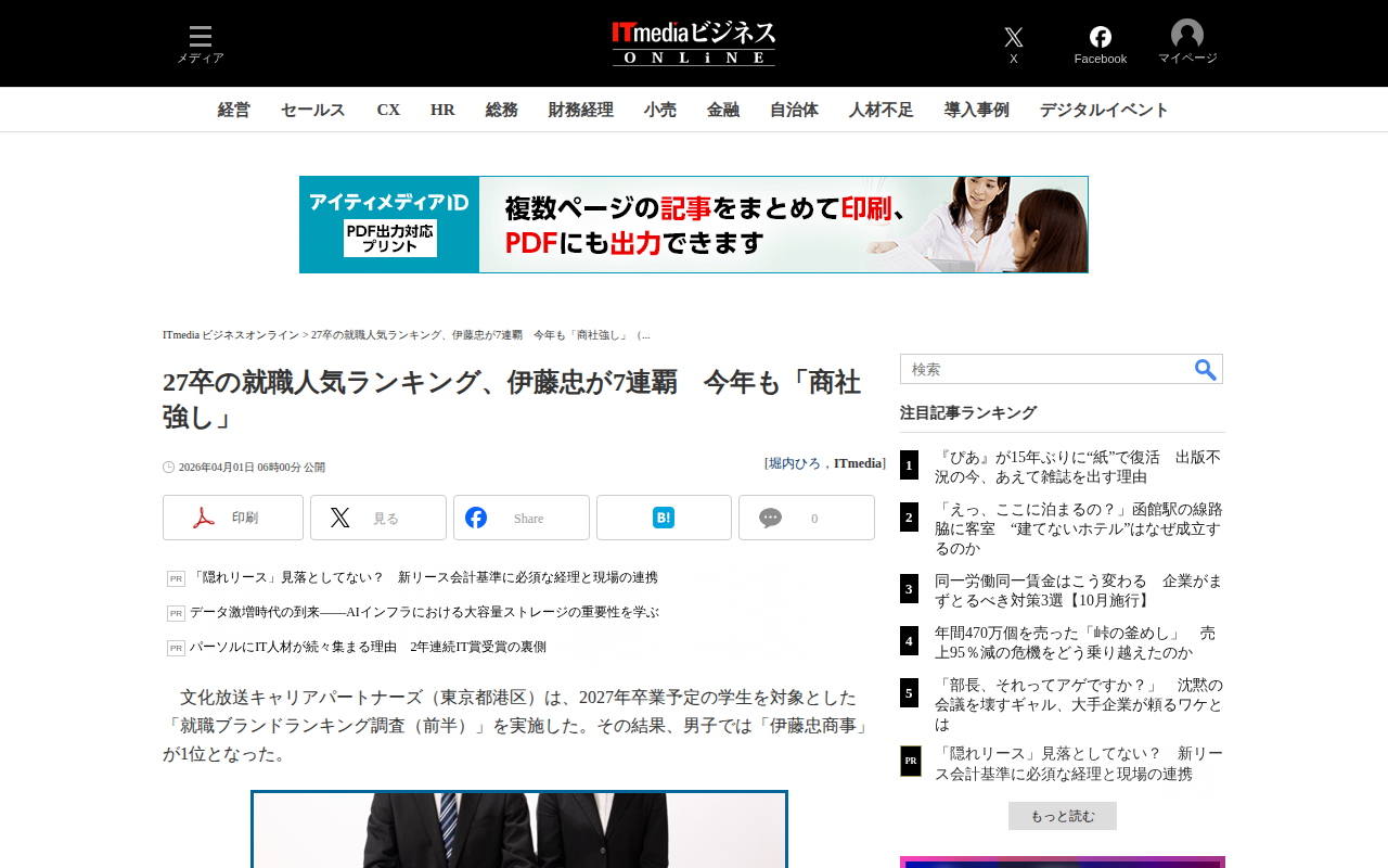 27卒の就職人気ランキング、伊藤忠が7連覇 今年も「商社強し」(1/2 ページ) - ITmedia ビジネスオンライン