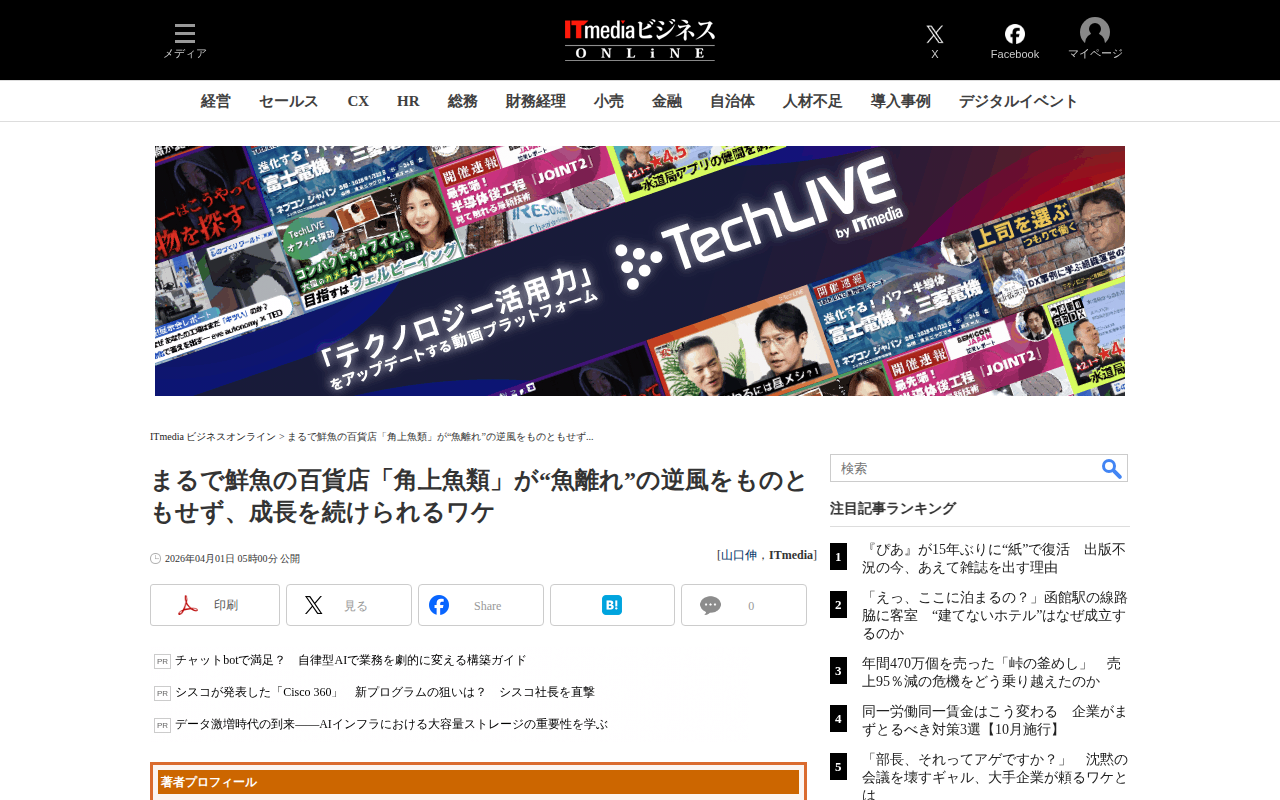 このページは、鮮魚販売の専門店「角上魚類」が消費者の魚離れという逆風の中で、17期連続の増収を達成し成長を続ける理由を探った記事である。1974年に新潟県で創業した同社は、現在22店舗を展開し、埼玉県を中心に関東地方で急...