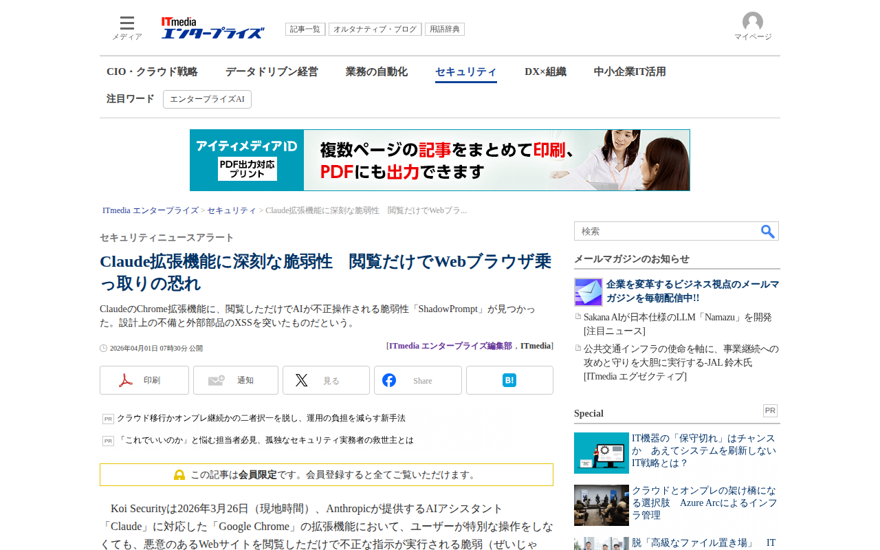 Claude拡張機能に深刻な脆弱性 閲覧だけでWebブラウザ乗っ取りの恐れ:セキュリティニュースアラート - ITmedia エンタープライズ