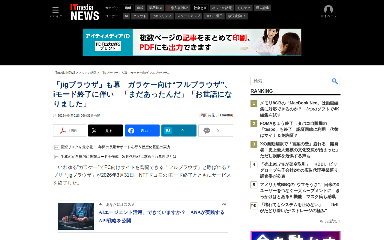 このページは、ガラケー向けフルブラウザアプリ「jigブラウザ」が2026年3月31日、NTTドコモのiモード終了とともにサービスを終了したことを報じている。2004年10月にリリースされたjigブラウザは、iモード携帯で...