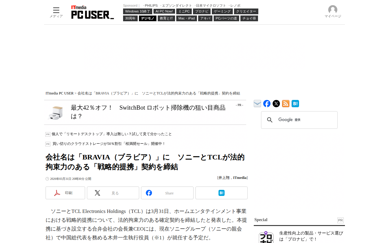会社名は「BRAVIA(ブラビア)」に ソニーとTCLが法的拘束力のある「戦略的提携」契約を締結 - ITmedia PC USER
