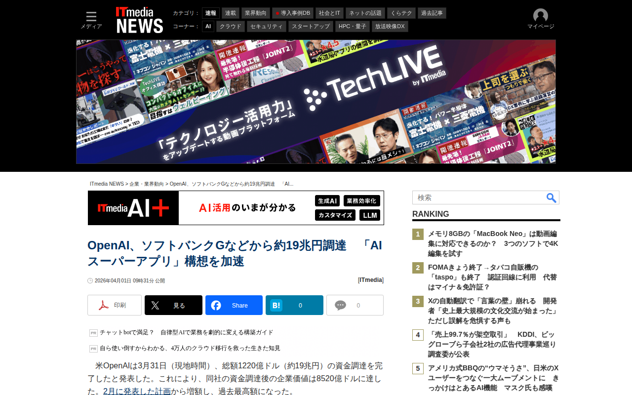 このページはOpenAIが約19兆円の資金調達を完了したことを報じています。ソフトバンクG、Amazon、NVIDIAが主導し、Microsoftも参加しました。調達後の企業価値は8520億ドルに達し、過去最高額となりま...