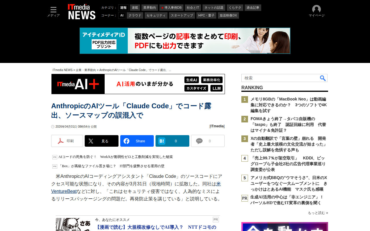 AnthropicのAIツール「Claude Code」でコード露出、ソースマップの誤混入で - ITmedia NEWS