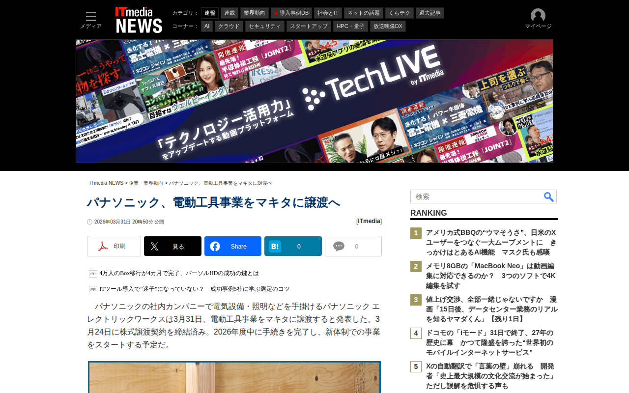 このページは、パナソニック エレクトリックワークスが電動工具事業をマキタに譲渡することを発表するニュース記事である。3月24日に株式譲渡契約を締結し、2026年度中に手続きを完了する予定。45年以上展開してきた電動工具事...
