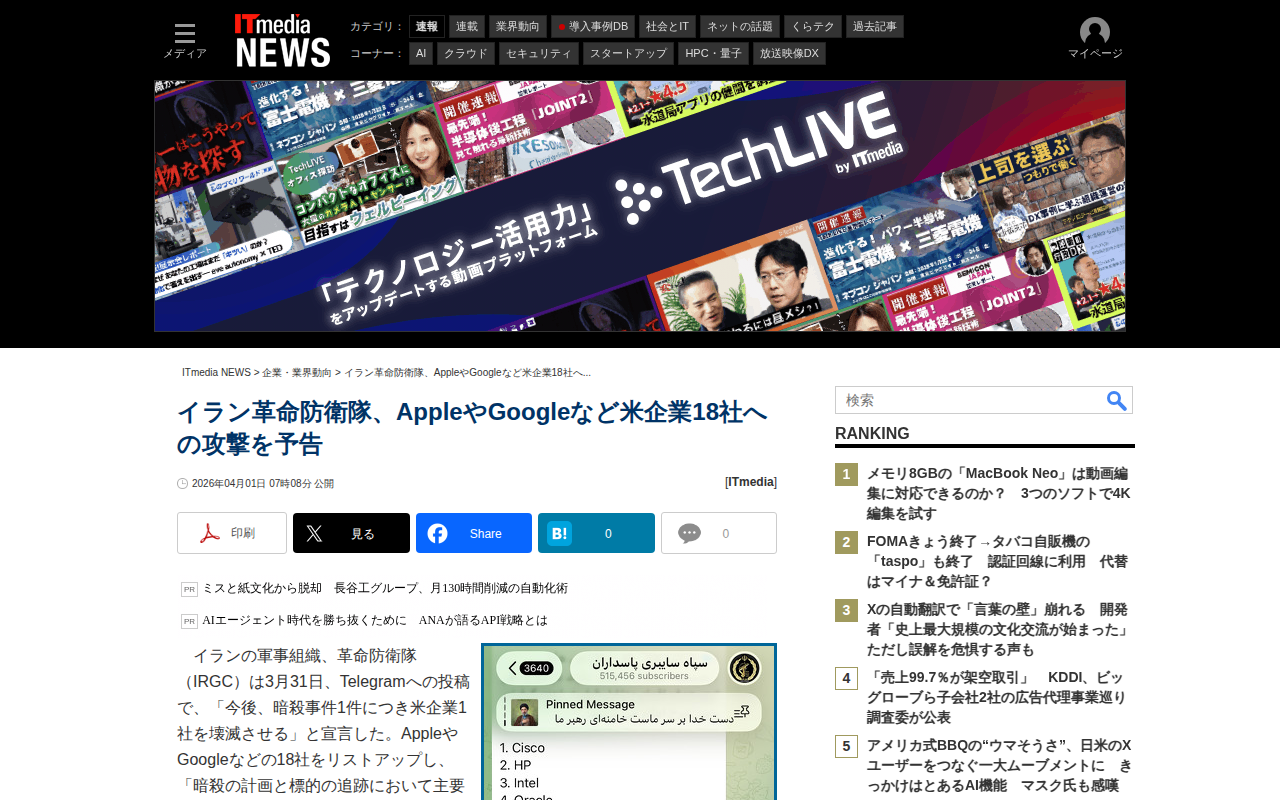 このページは、イラン革命防衛隊がTelegramで、AppleやGoogleなど米企業18社への攻撃を予告したニュースを報じています。同組織は「暗殺事件1件につき米企業1社を壊滅させる」と宣言し、これらの企業がテヘラン時...