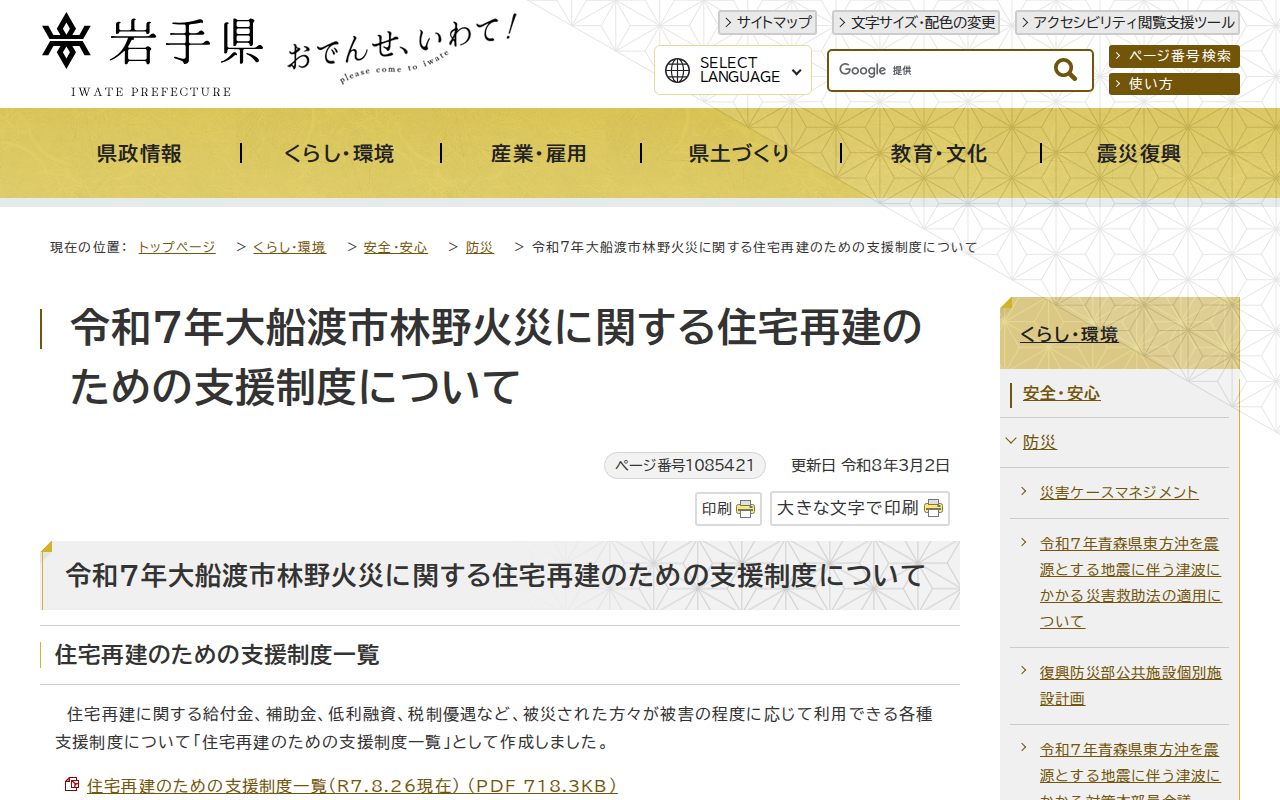 岩手県 - 令和7年大船渡市林野火災に関する住宅再建のための支援制度について