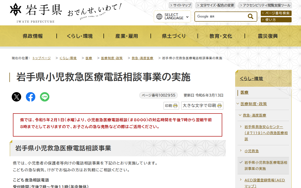 岩手県 - 岩手県小児救急医療電話相談事業の実施