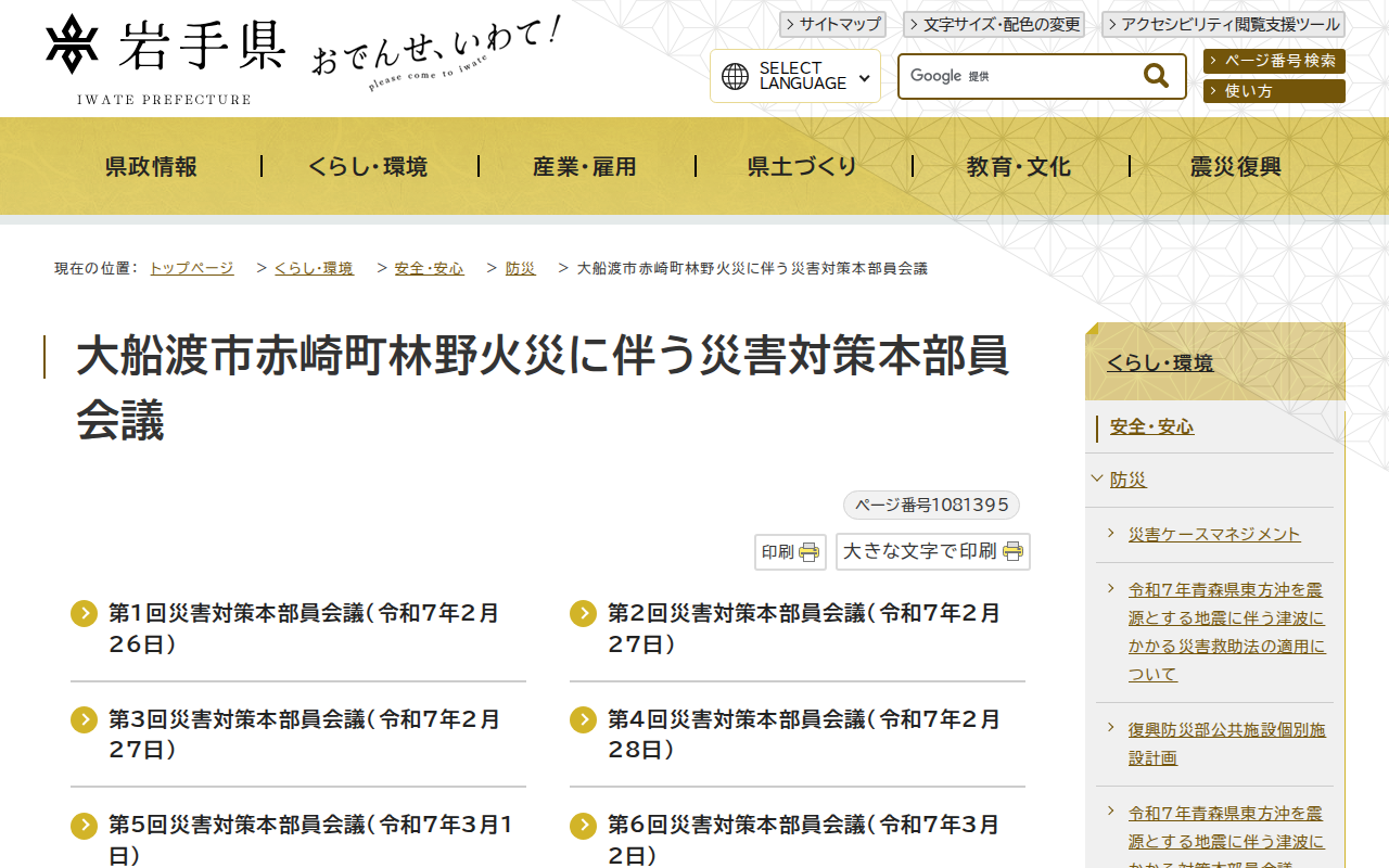 岩手県 - 大船渡市赤崎町林野火災に伴う災害対策本部員会議