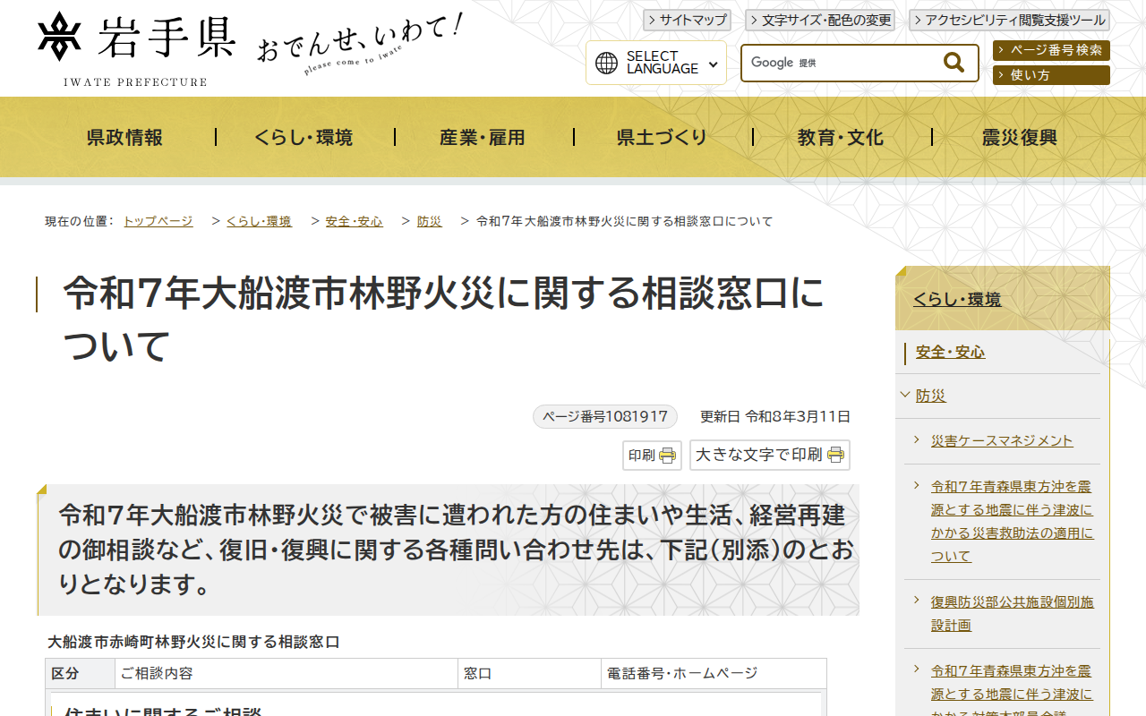 岩手県 - 令和7年大船渡市林野火災に関する相談窓口について