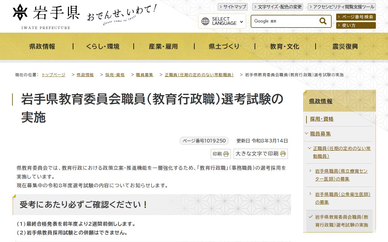 岩手県 - 岩手県教育委員会職員(教育行政職)選考試験の実施