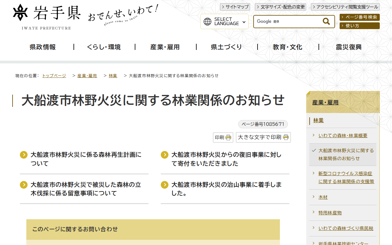 岩手県 - 大船渡市林野火災に関する林業関係のお知らせ