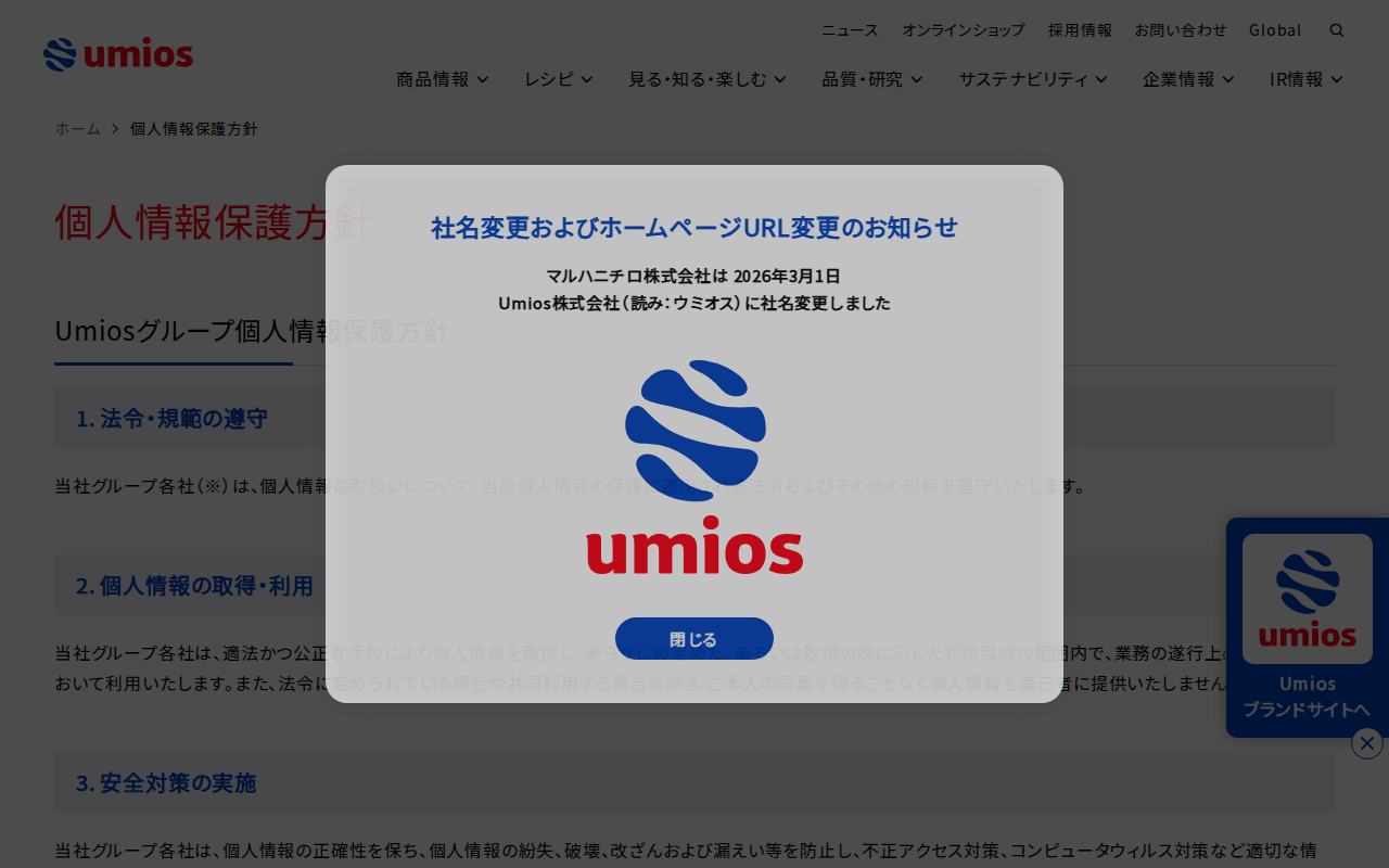 このページはUmios株式会社の個人情報保護方針を示しています。同社グループは個人情報の取扱いにおいて法令を遵守し、適法かつ公正な手段で個人情報を取得・利用します。本人の同意なく第三者提供はしません。情報セキュリティ対策...