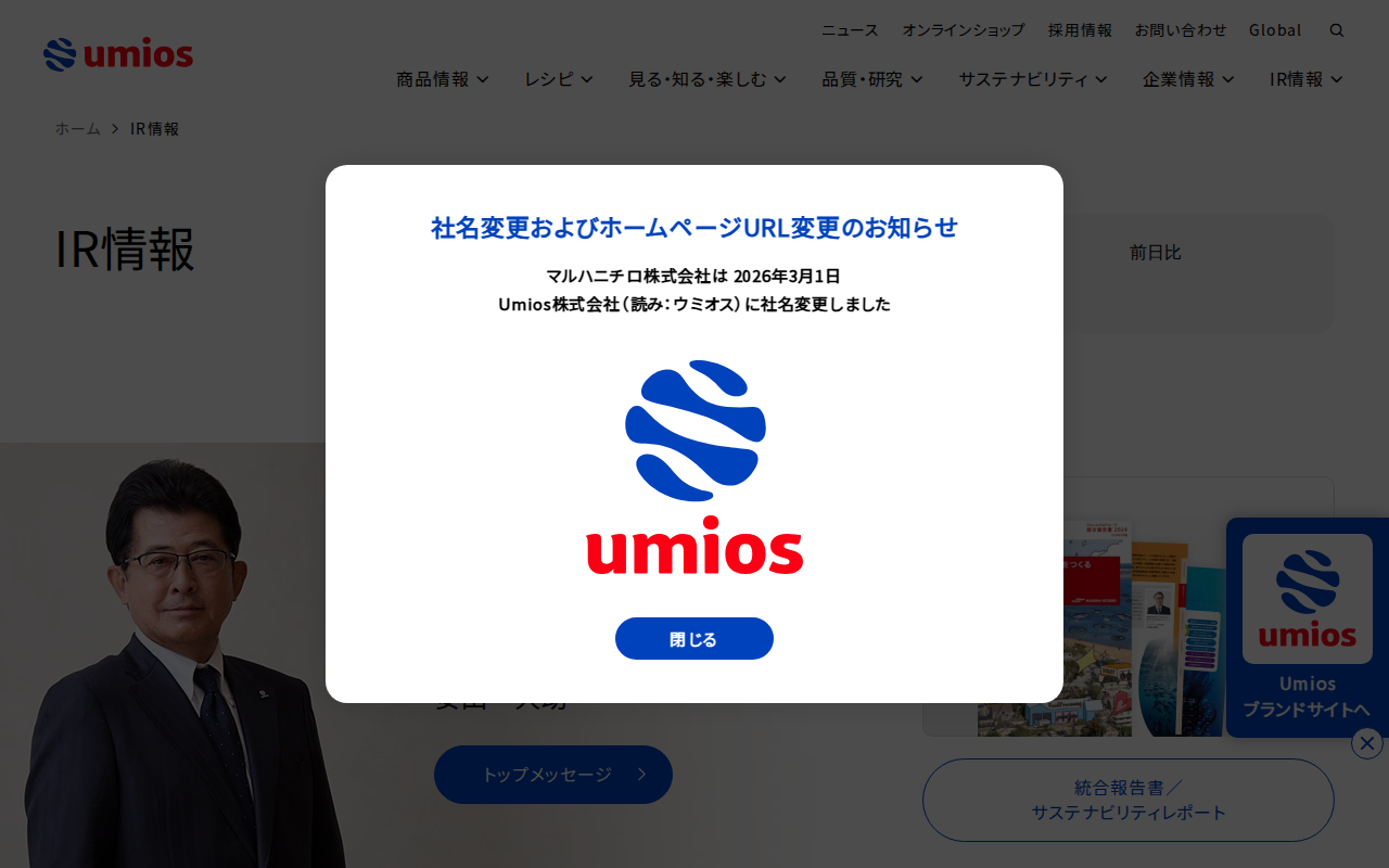 このページはUmios株式会社のIR情報ページです。代表取締役社長による企業変革推進メッセージ、統合報告書・サステナビリティレポート、決算短信などの最新IR資料を掲載しています。財務ハイライト、IRカレンダー、株式情報、...