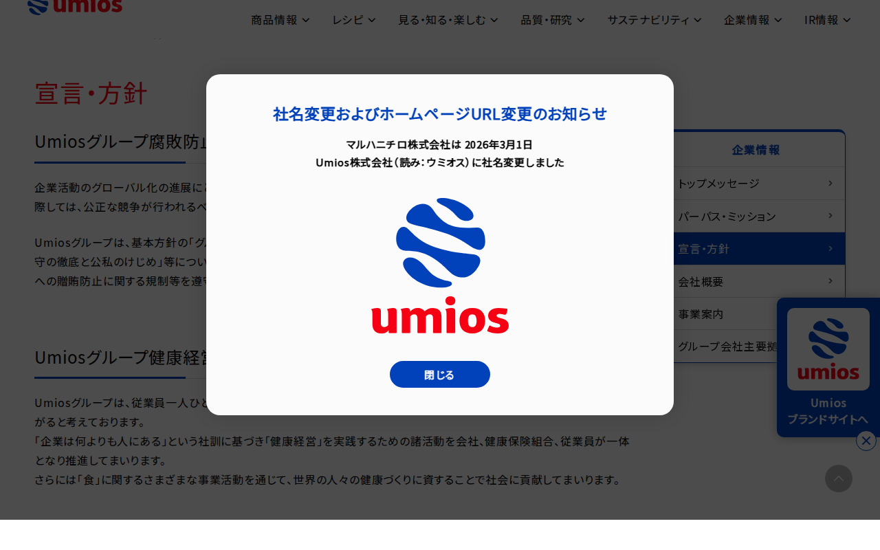このページはUmiosグループの企業方針と宣言をまとめたものです。腐敗防止宣言では、グローバル化する事業における公正な競争と法令遵守を掲げています。健康経営宣言では、従業員の心身の健康と能力発揮が企業発展につながると考え...