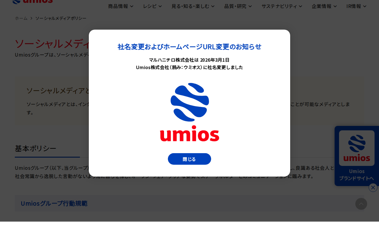 このページはUmiosグループのソーシャルメディアポリシーについて説明しています。同グループの従業員は、ソーシャルメディア利用時に国内外の法令と行動指針を遵守し、責任ある行動を心がけることを定めています。安全・品質、品格...