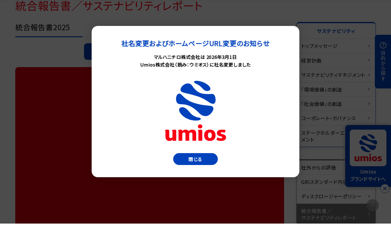 このページはUmios(マルハニチロ)の統合報告書およびサステナビリティレポートを公開しています。2025年の統合報告書では、ブランド名変更からソリューションカンパニーへの転換、新長期ビジョン「For the ocean...