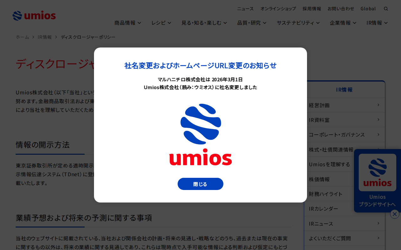 このページはUmios株式会社のディスクロージャーポリシーについて記載しています。同社は株主・投資家に対し、透明性と公平性を基本に迅速な情報提供を行うことを方針としています。重要情報は東京証券取引所の適時開示規則に従い、...
