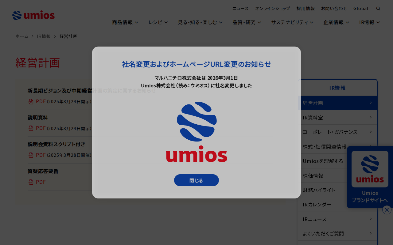 このページはUmios(旧マルハニチロ)のIR情報サイトの経営計画セクションです。新長期ビジョンと中期経営計画の策定に関する情報を提供しており、2025年3月24日に開示された公式PDFドキュメント、説明資料、説明会資料...