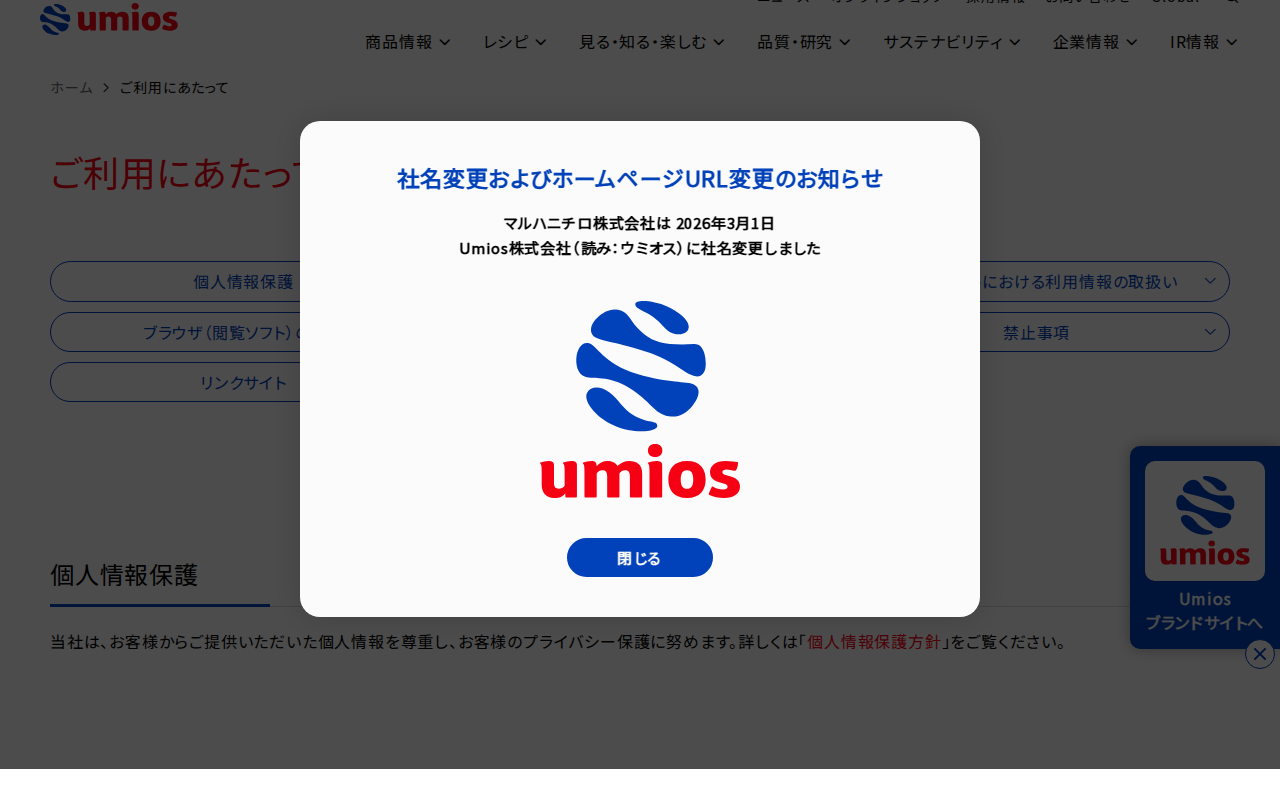 このページはUmiosのウェブサイト利用規約です。個人情報保護、セキュリティ、クッキーやWebビーコンの使用、ブラウザ設定などについて説明しています。SSLにより個人情報を暗号化して保護し、クッキーで利便性を向上させてい...