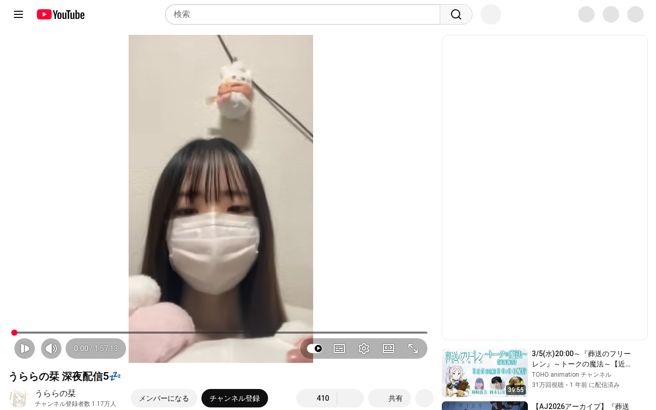 このページは、うららの栞チャンネルによる深夜配信の動画ページです。配信時間は約1時間57分で、5か月前に配信されました。チャンネル登録者数は1.17万人。動画には説明文が追加されていませんが、チャットのリプレイ機能でライ...