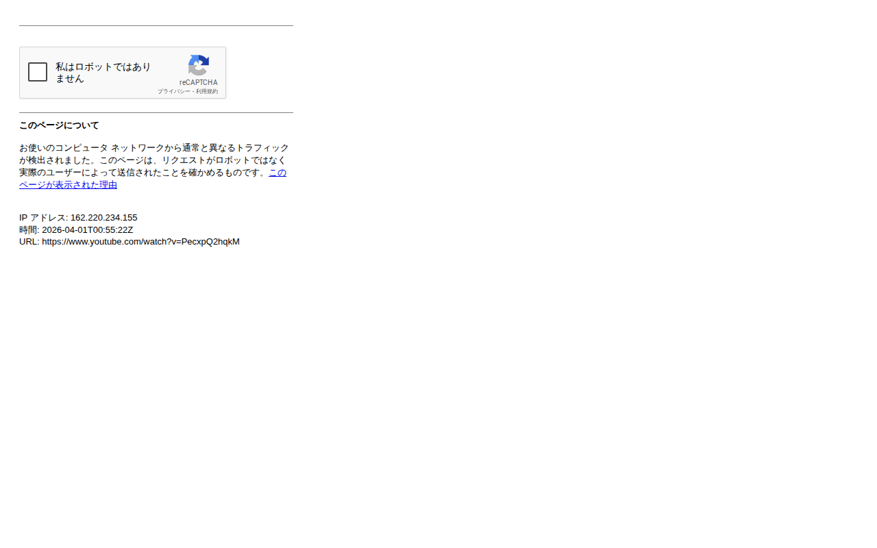 このページは、ユーザーのコンピュータネットワークから通常と異なるトラフィックが検出されたため表示されています。Googleのセキュリティシステムがリクエストをロボットではなく実際のユーザーが送信したものであることを確認す...