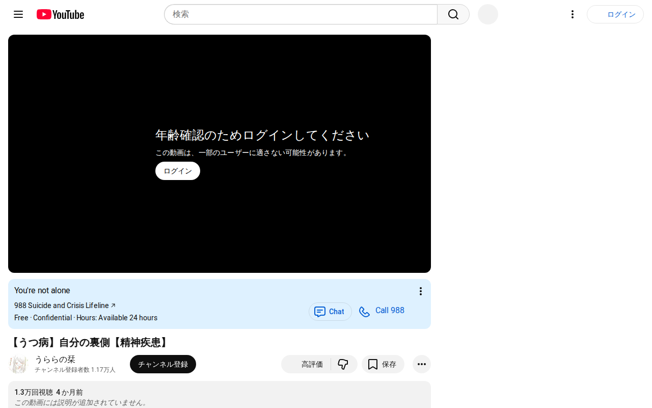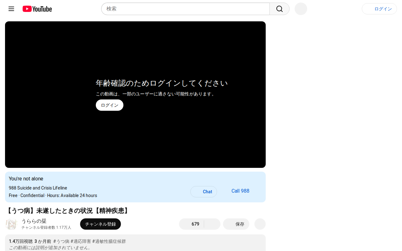 このページはうつ病と精神疾患に関するYouTube動画です。うつ病の患者が自殺未遂時の状況について語る内容となっており、年齢制限がかけられています。動画には詳細な説明文が記載されていませんが、うつ病、適応障害、過敏性腸症...
