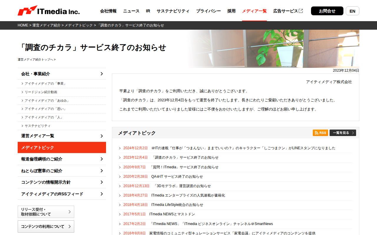 このページは、アイティメディア株式会社が運営していた「調査のチカラ」というサービスの終了を告知する内容です。同サービスは2023年12月4日をもって運営を終了することが発表されています。長年のご利用に対する感謝の意が述べられており、利用者に