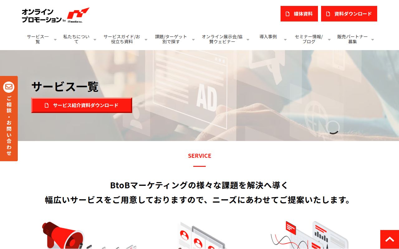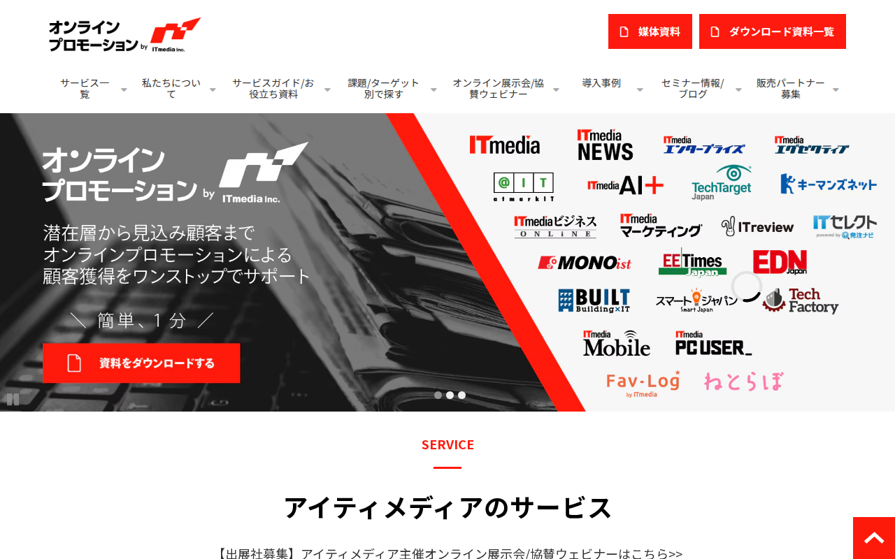 このページはアイティメディア株式会社のオンラインプロモーションサービスを紹介しています。4億PVを超える専門メディアネットワークを活用し、リード獲得、タイアップ記事広告、メールマガジン広告、バナー広告、BtoBリサーチ、Webセミナー、セミ