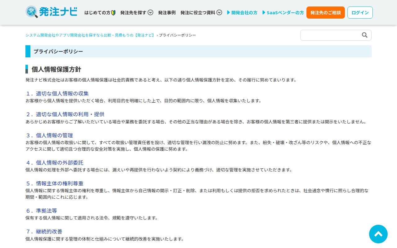 プライバシーポリシー | システム開発会社やアプリ開発会社を探すなら比較・見積もりの【発注ナビ】