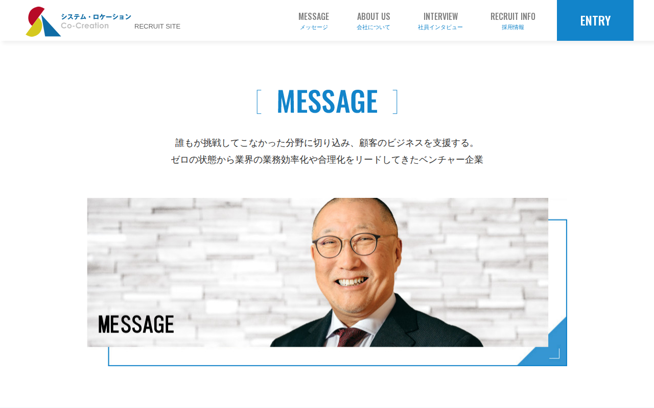 このページはシステム・ロケーション株式会社の採用サイトです。同社は誰もが挑戦してこなかった分野に切り込み、顧客のビジネス支援を行うベンチャー企業です。長年の取り組みで蓄積した唯一無二の膨大なデータを活用したサービスを提供し、無借金で堅実経営