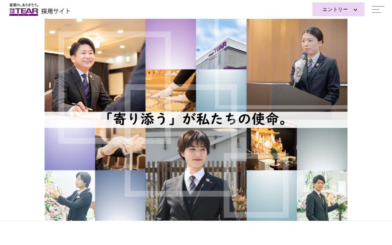 このページは、株式会社ティアの採用サイトです。遺族に寄り添った「感動葬儀」を提供する同社の採用情報を掲載しています。会社の魅力や働く環境、ビジョン、代表メッセージなどを紹介するほか、葬祭プランナーやマネージャーなど実際に働く社員のインタビュ