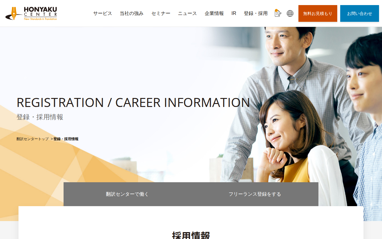 このページは、英訳・翻訳会社「翻訳センター」の登録・採用情報を扱うサイトです。東京・大阪・名古屋の各拠点でキャリア採用やパート・アルバイト採用を随時募集しており、フリーランス登録も可能です。社員紹介や職種紹介、会社紹介を通じて、高付加価値サ