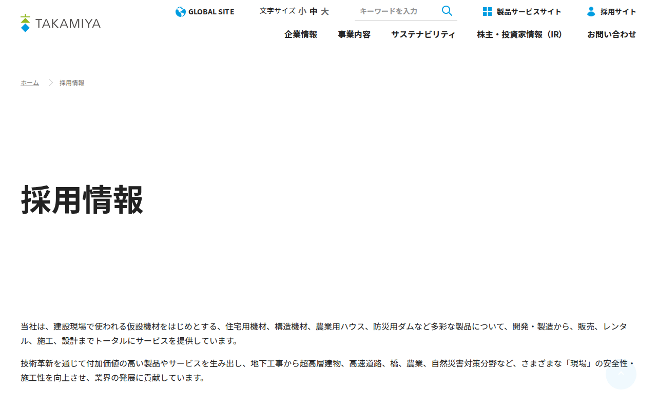 このページはタカミヤの採用情報を紹介しています。同社は建設現場の仮設機材、住宅用機材、農業用ハウス、防災用ダムなど多彩な製品を開発・製造から販売、レンタル、施工、設計までトータルにサービス提供しています。技術革新を通じて付加価値の高い製品を