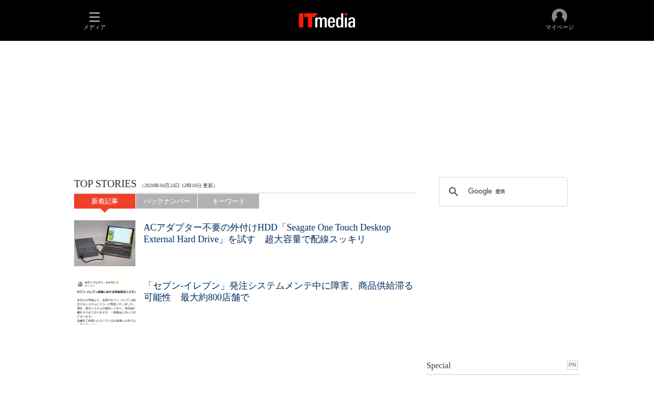 このページはITmedia のホームページで、IT関連の最新ニュースと製品情報を提供しています。2026年4月24日時点で、ACアダプター不要の外付けHDDやセブン-イレブンの発注システム障害、楽天モバイルの5Gルーター販売一時停止などのト