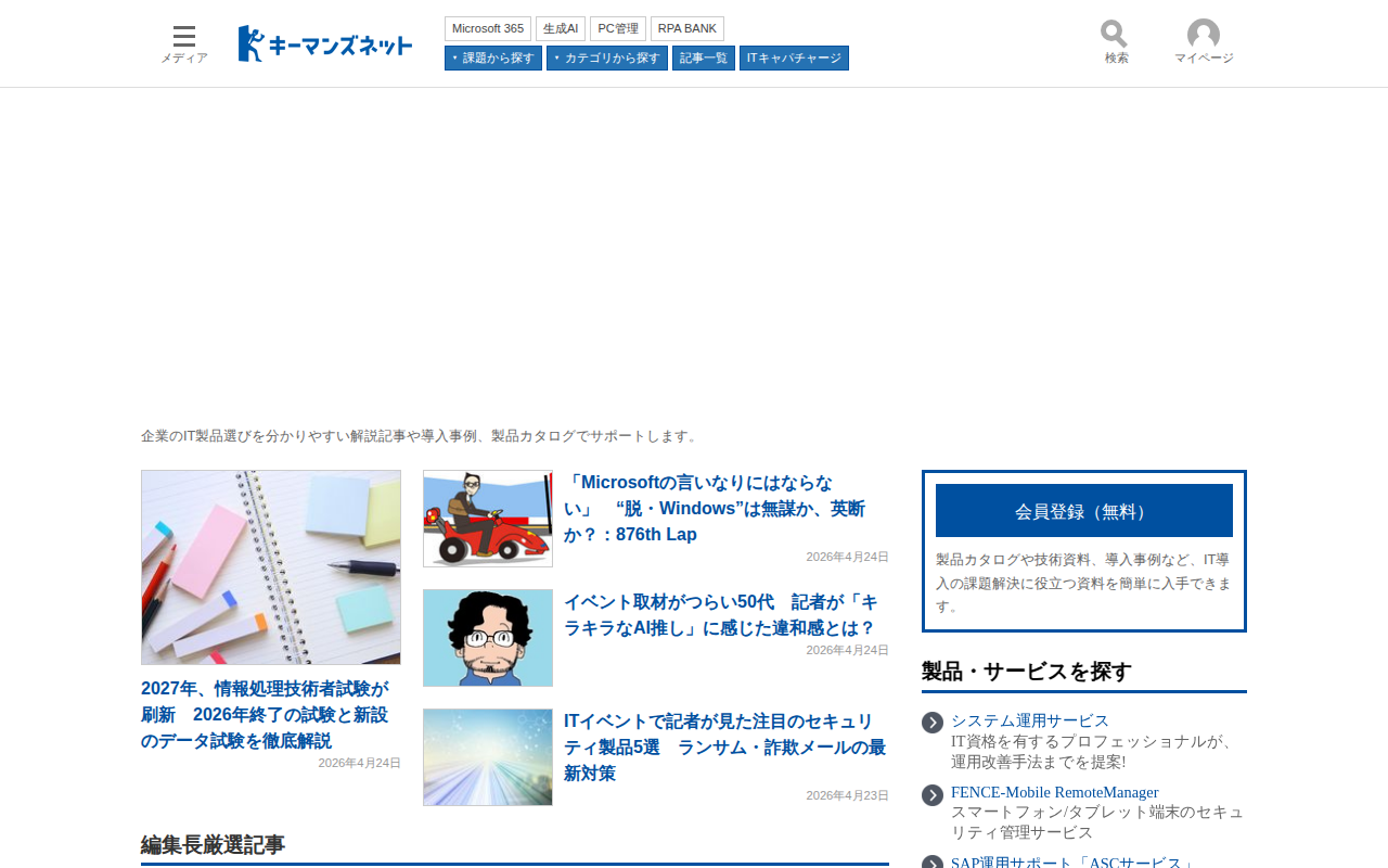 このページは、企業のIT製品・サービス選びをサポートするキーマンズネットのポータルサイトです。解説記事や導入事例、製品カタログを通じて、IT担当者の課題解決を支援しています。最新コンテンツとしては、2027年の情報処理技術者試験刷新、ITイ